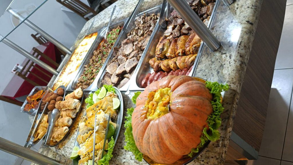 • Buffet variado com pratos quentes, saladas, grelhados e sobremesas