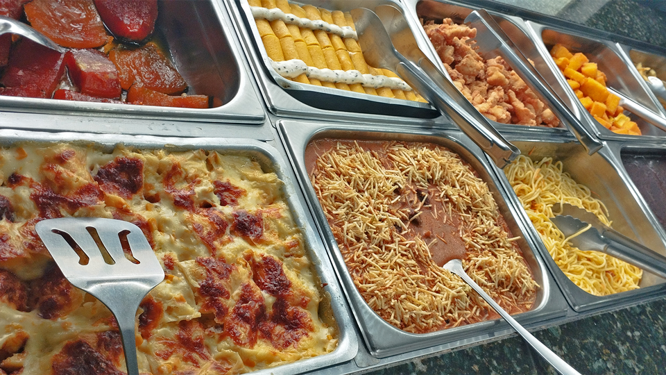 • Buffet variado com pratos quentes, saladas, grelhados e sobremesas